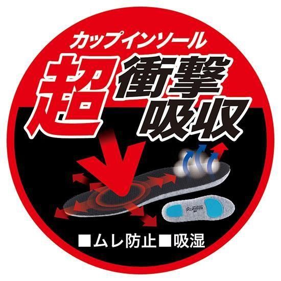 つま先とかかと部の衝撃吸収素材で足・膝・腰への衝撃を吸収し、フェルトカップインソールでクッション性・吸湿性を発揮!