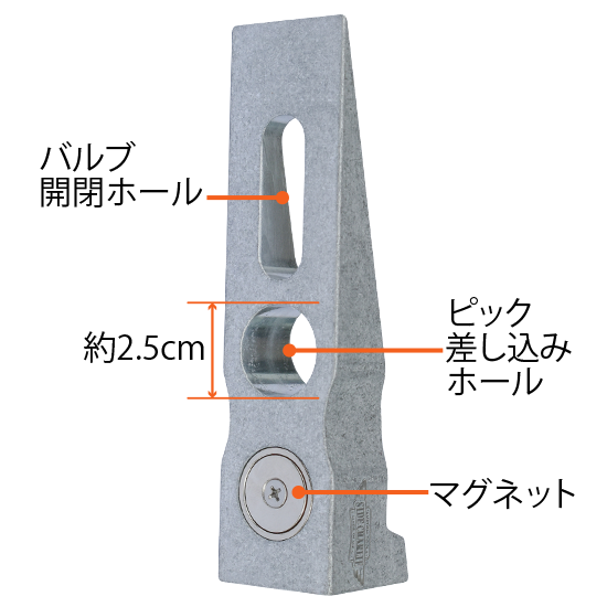 また、約2.5cmのピック差し込みホールと、バルブ開閉⽤の細⻑いホールを備えています。